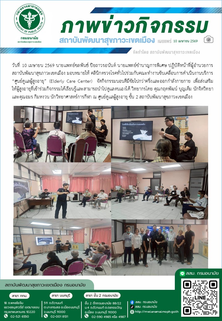 นที่ 10 เมษายน 2569 สถาบันพัฒนาสุขภาวะเขตเมือง จัดกิจกรรม นอนดีมีชัยไปกว่าครึ่งและออกกำลังกายกาย ณ ศูนย์ดูแลผู้สูงอายุ ชั้น 2 สถาบันพัฒนาสุขภาวะเขตเมือง