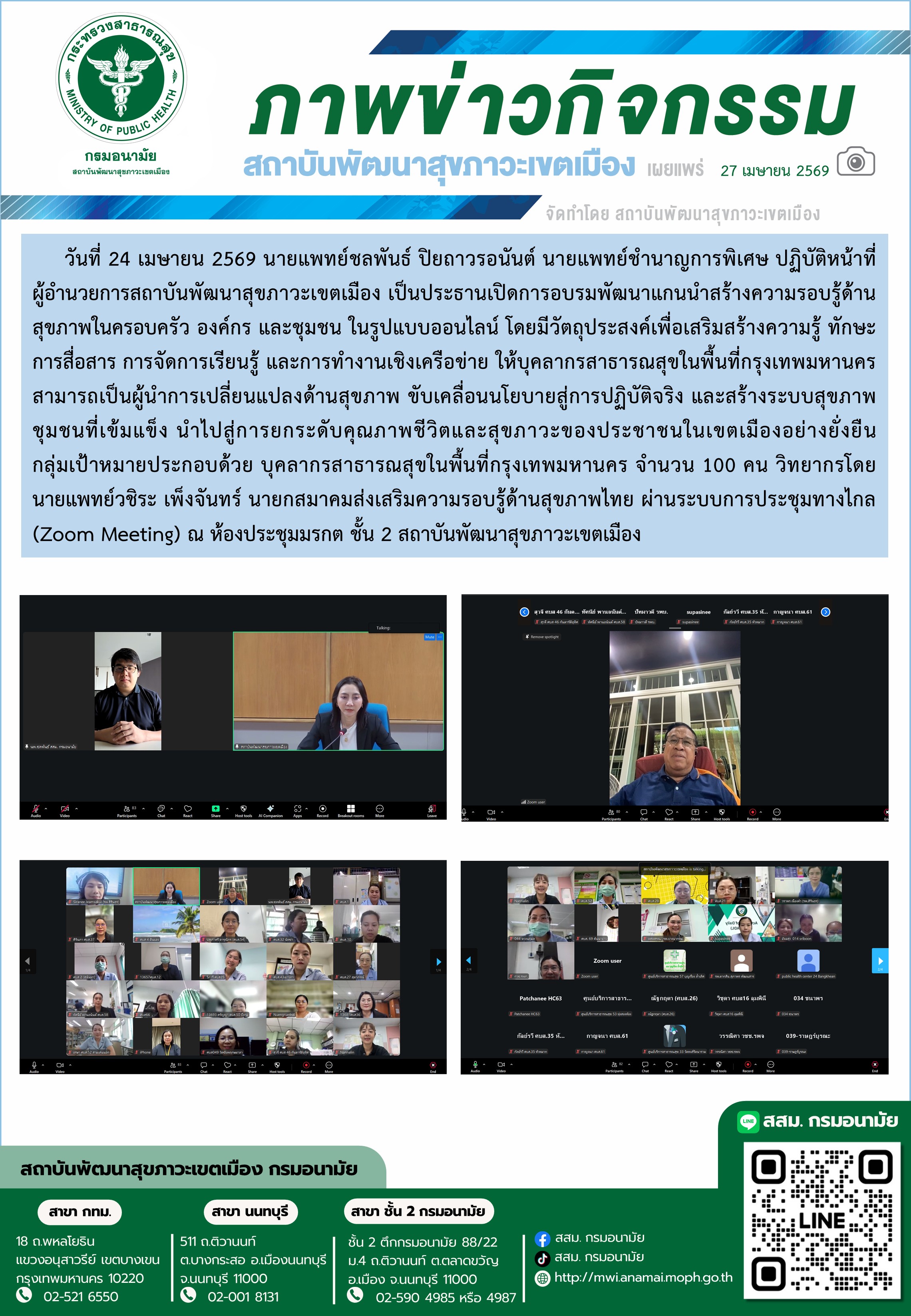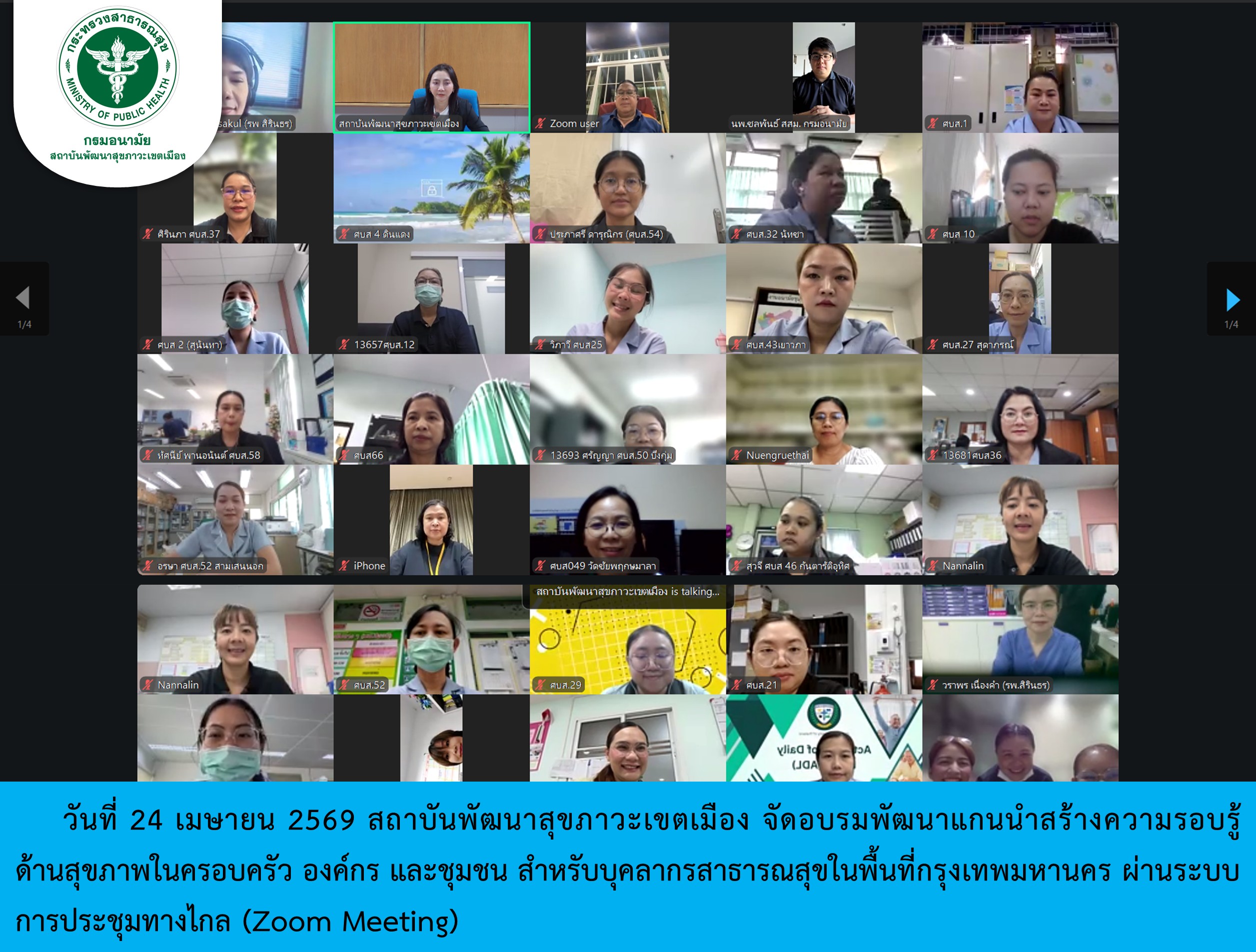 นที่ 24 เมษายน 2569 สถาบันพัฒนาสุขภาวะเขตเมือง จัดอบรมพัฒนาแกนนำสร้างความรอบรู้ด้านสุขภาพในครอบครัว องค์กร และชุมชน สำหรับบุคลากรสาธารณสุขในพื้นที่กรุงเทพมหานคร ผ่านระบบการประชุมทางไกล (Zoom Meeting)