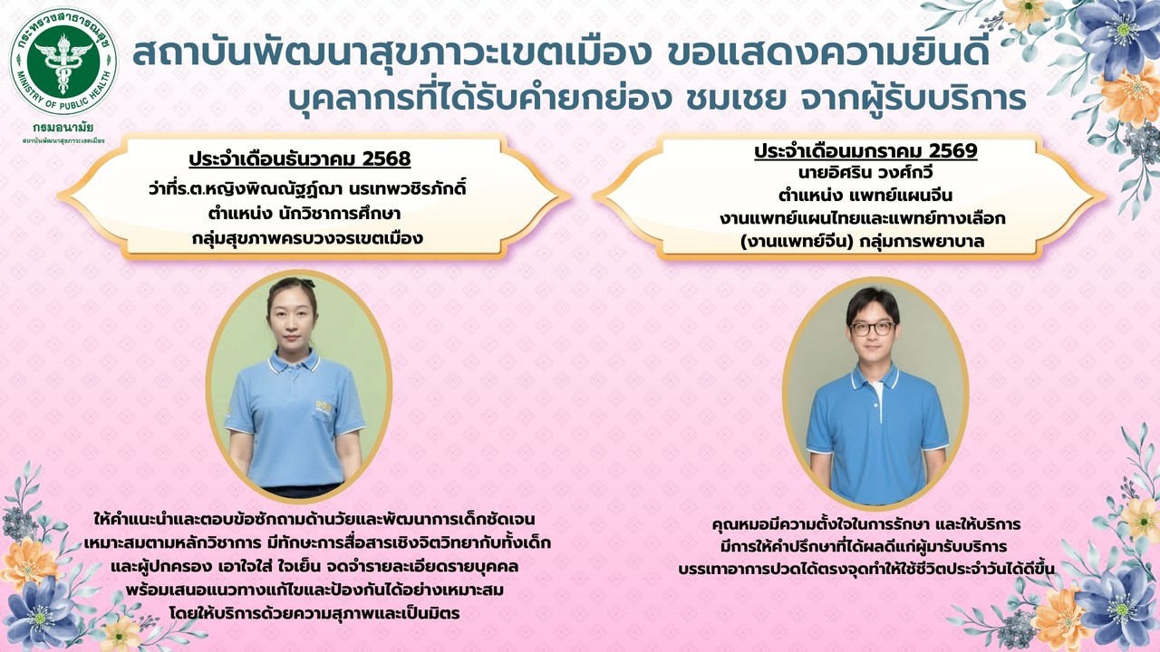 สถาบันพัฒนาสุขภาวะเขตเมือง ขอแสดงความยินดีกับบุคลากรที่ได้รับการยกย่องชมเชยจากผู้มารับบริการ ประจำเดือนธันวาคม 2568 และ ประจำเดือนมกราคม 2569 ความทุ่มเท ตั้งใจ และการให้บริการด้วยหัวใจของท่านเป็นพลังสำคัญที่ช่วยสร้างความประทับใจและสะท้อนถึงมาตรฐานการให้บริการที่มีคุณภาพของสถาบันขอขอบคุณในความมุ่งมั่น และเป็นกำลังใจให้บุคลากรทุกท่าน ร่วมกันพัฒนางานบริการเพื่อประชาชนอย่างต่อเนื่อง