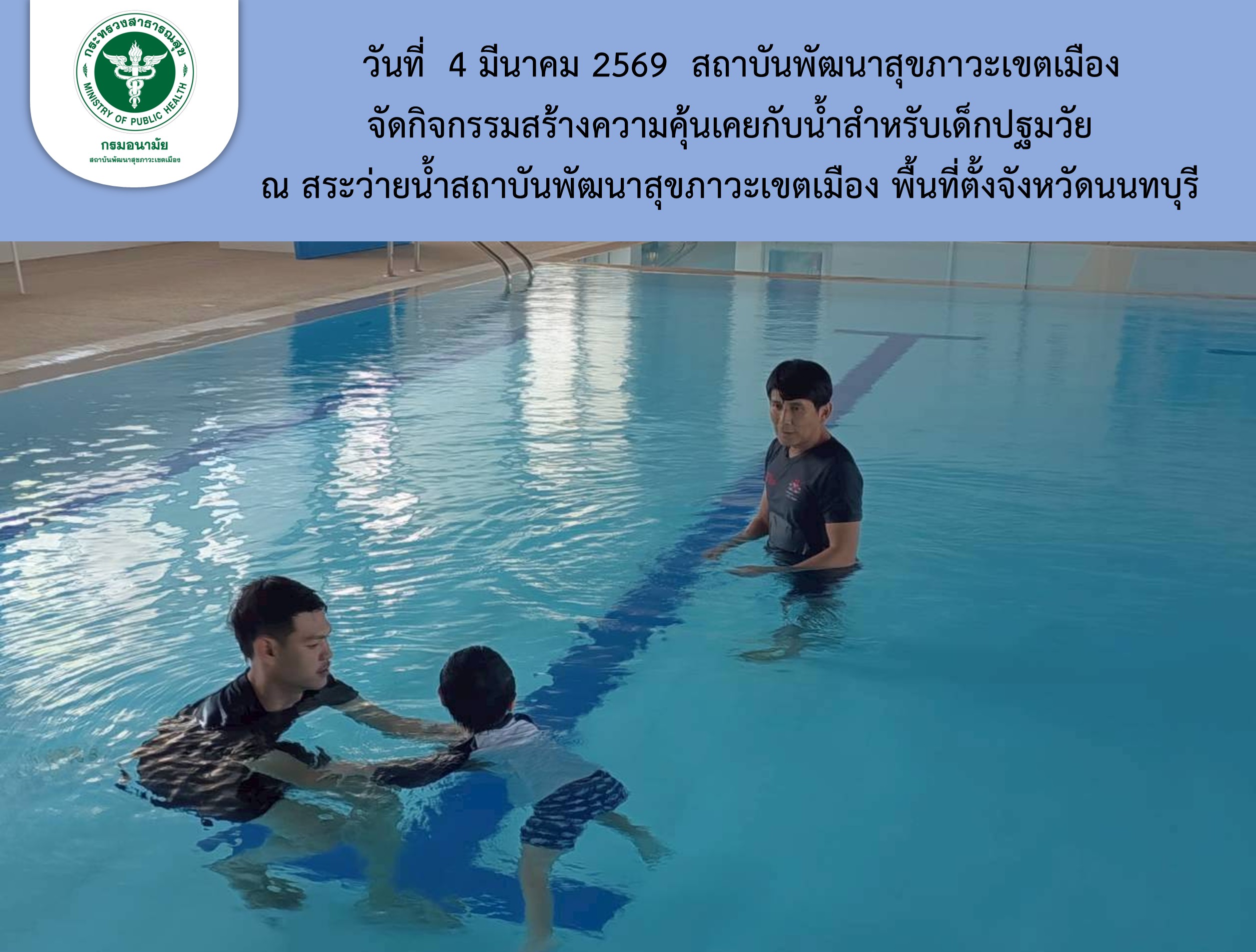 นที่ 4 มีนาคม 2569 สถาบันพัฒนาสุขภาวะเขตเมือง จัดกิจกรรมสร้างความคุ้นเคยกับน้ำสำหรับเด็กปฐมวัย ณ สระว่ายน้ำ สถาบันพัฒนาสุขภาวะเขตเมือง พื้นที่ตั้งจังหวัดนนทบุรี