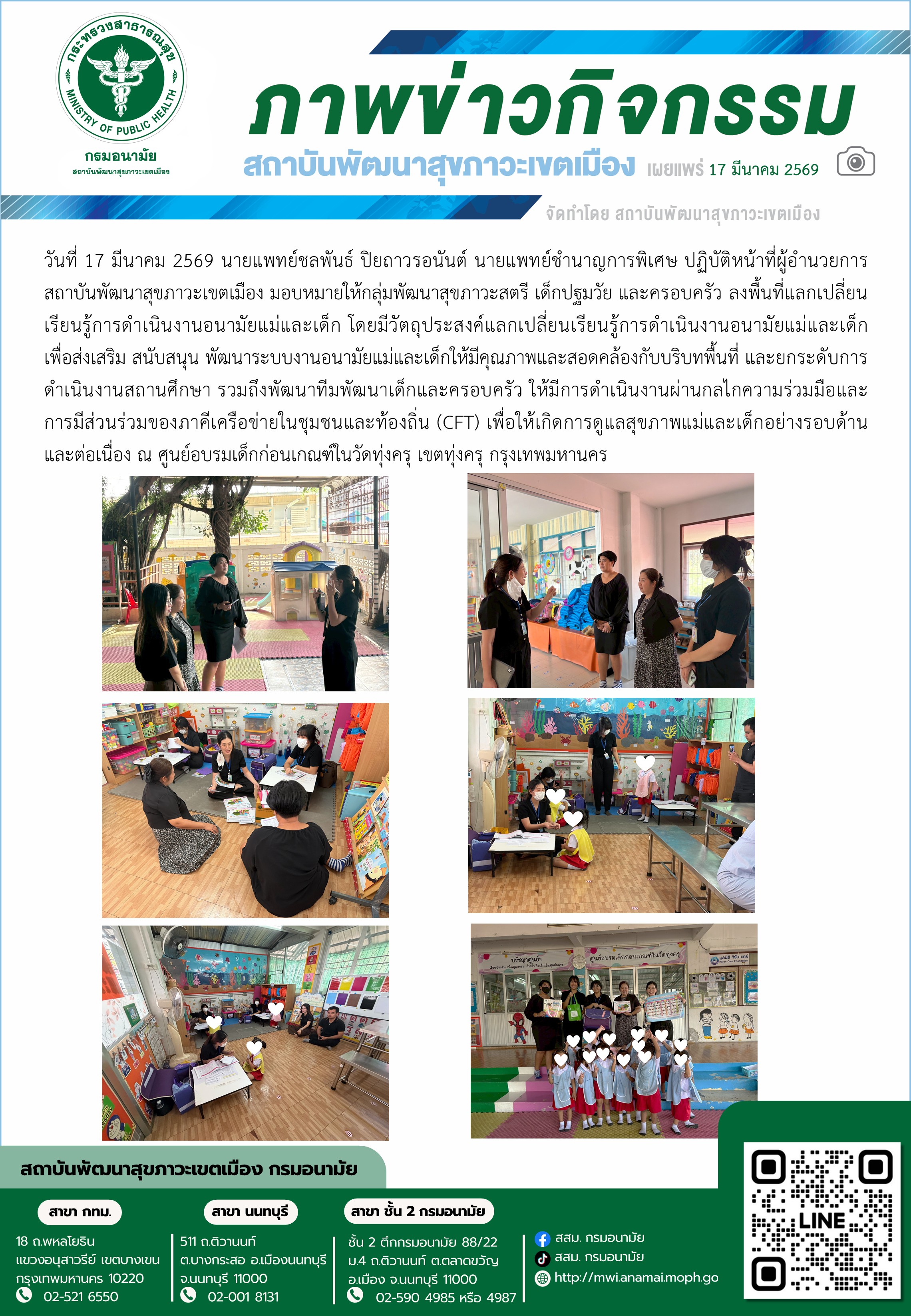 นที่ 17 มีนาคม 2569 สถาบันพัฒนาสุขภาวะเขตเมือง ลงพื้นที่แลกเปลี่ยนเรียนรู้การดำเนินงานอนามัยแม่และเด็ก ณ ศูนย์อบรมเด็กก่อนเกณฑ์ในวัดทุ่งครุ เขตทุ่งครุ กรุงเทพมหานคร