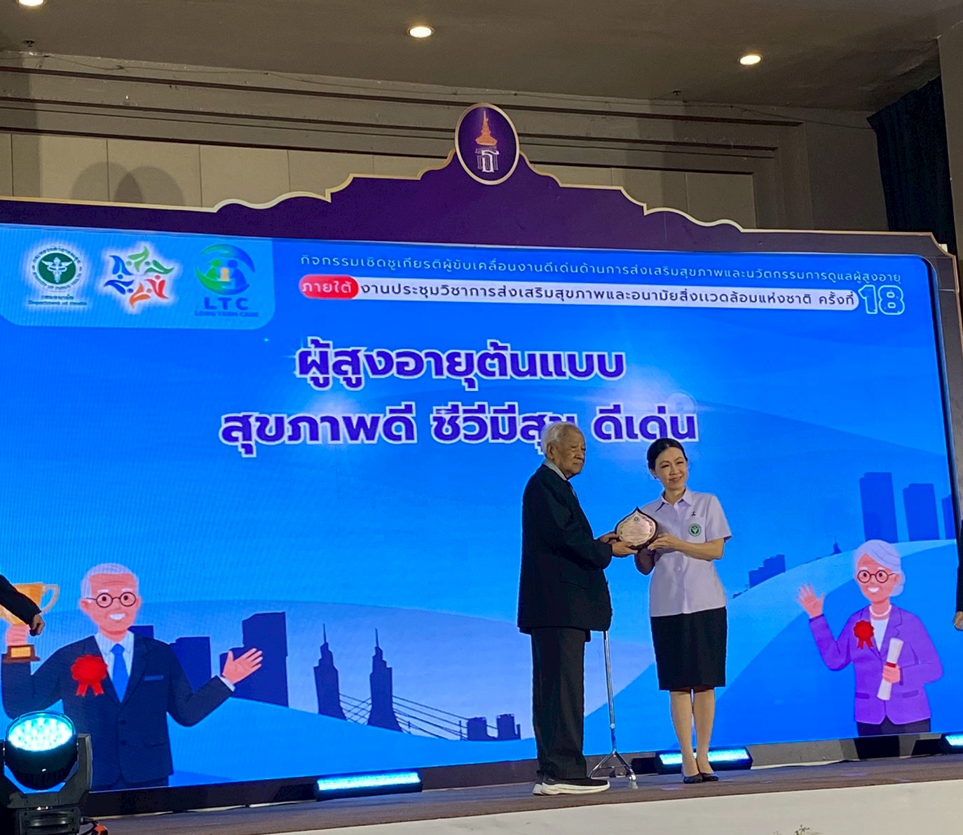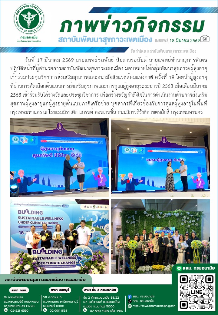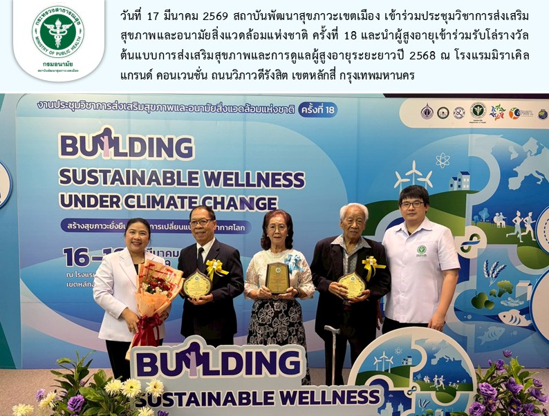 นที่ 17 มีนาคม 2569 สถาบันพัฒนาสุขภาวะเขตเมือง นำผู้สูงอายุเข้าร่วมรับโล่รางวัลต้นแบบการส่งเสริมสุขภาพและการดูแลผู้สูงอายุระยะยาวในงานวิชาการส่งเสริมสุขภาพและอนามัยสิ่งแวดล้อมแห่งชาติ ครั้งที่ 18 ณ โรงแรมมิราเคิล แกรนด์ คอนเวนชั่น หลักสี่ กรุงเทพมหานคร