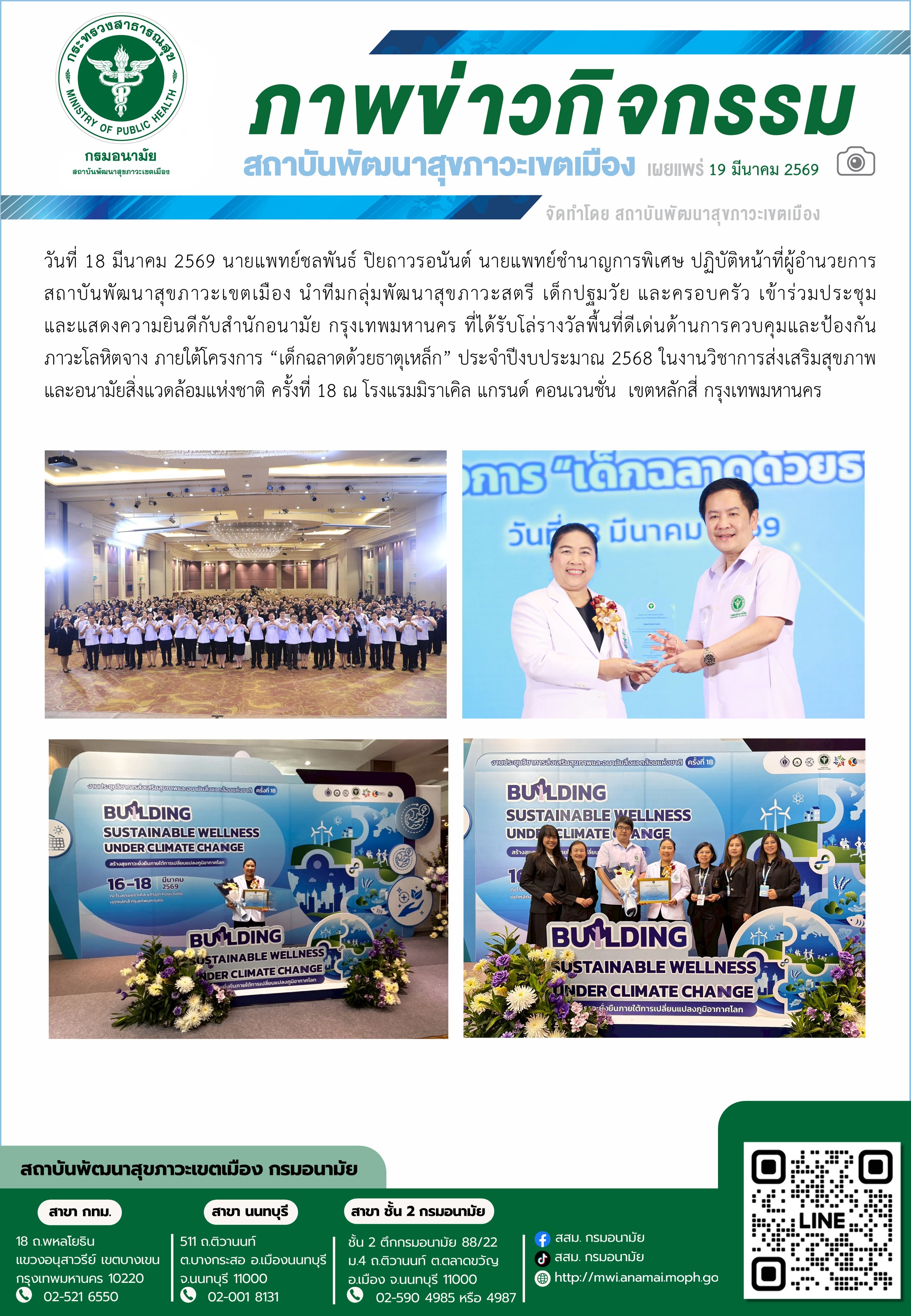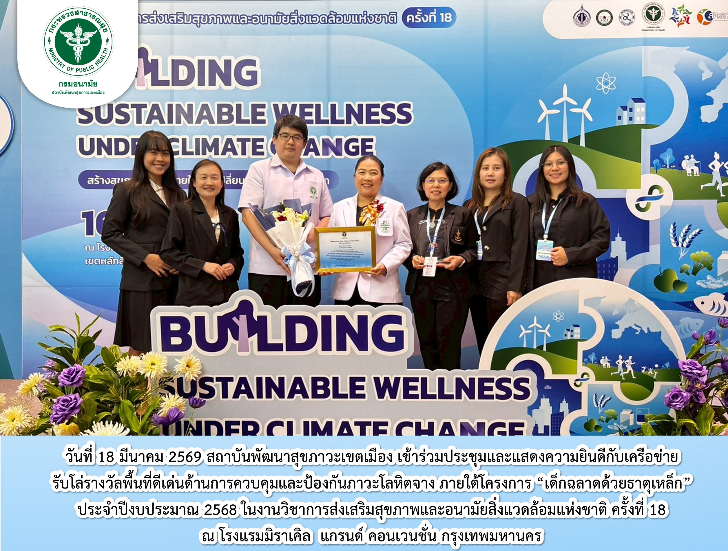นที่ 18 มีนาคม 2569 สถาบันพัฒนาสุขภาวะเขตเมือง เข้าร่วมประชุมและแสดงความยินดีกับเครือข่ายรับโล่รางวัลพื้นที่ดีเด่นด้านการควบคุมและป้องกันภาวะโลหิตจาง ภายใต้โครงการ “เด็กฉลาดด้วยธาตุเหล็ก” ในงานวิชาการส่งเสริมสุขภาพและอนามัยสิ่งล้อมแห่งชาติ ครั้งที่ 18