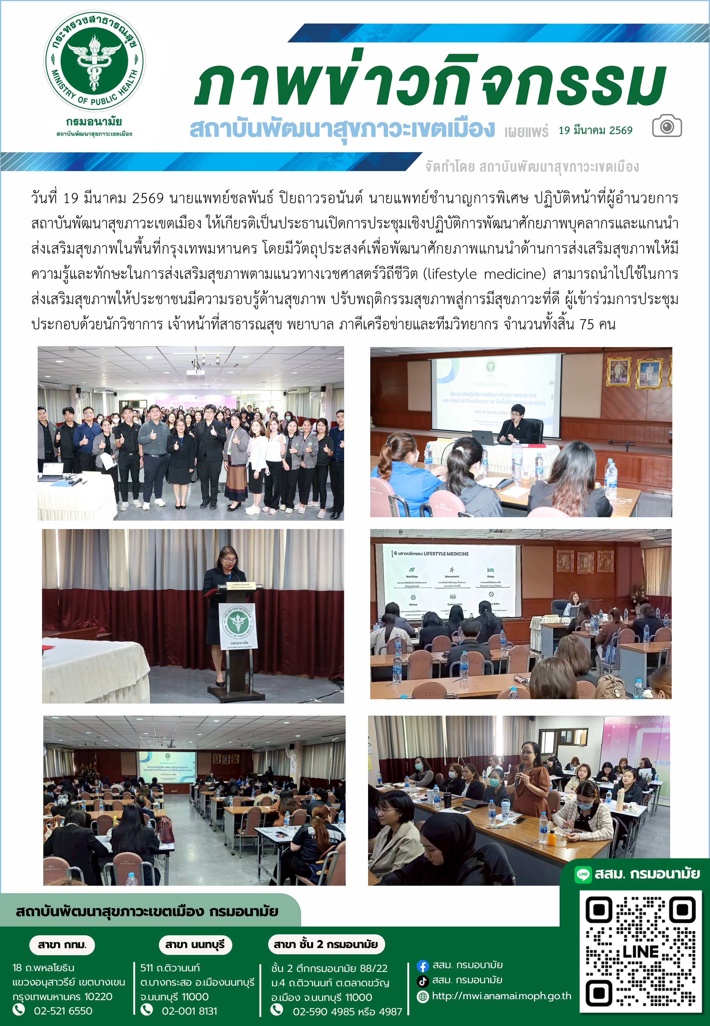 วันที่ 19 มีนาคม 2569 นายแพทย์ชลพันธ์ ปิยถาวรอนันต์ นายแพทย์ชำนาญการพิเศษ ปฏิบัติหน้าที่ผู้อำนวยการสถาบันพัฒนาสุขภาวะเขตเมือง ให้เกียรติเป็นประธานเปิดการประชุมเชิงปฏิบัติการพัฒนาศักยภาพบุคลากรและแกนนำส่งเสริมสุขภาพในพื้นที่กรุงเทพมหานคร โดยมีวัตถุประสงค์เพื่อพัฒนาศักยภาพแกนนำด้านการส่งเสริมสุขภาพให้มีความรู้และทักษะในการส่งเสริมสุขภาพตามแนวทางเวชศาสตร์วิถีชีวิต (lifestyle medicine) สามารถนำไปใช้ในการส่งเสริมสุขภาพให้ประชาชนมีความรอบรู้ด้านสุขภาพ ปรับพฤติกรรมสุขภาพสู่การมีสุขภาวะที่ดี ผู้เข้าร่วมการประชุมประกอบด้วยนักวิชาการ เจ้าหน้าที่สาธารณสุข พยาบาล ภาคีเครือข่ายและทีมวิทยากร จำนวนทั้งสิ้น 75 คน