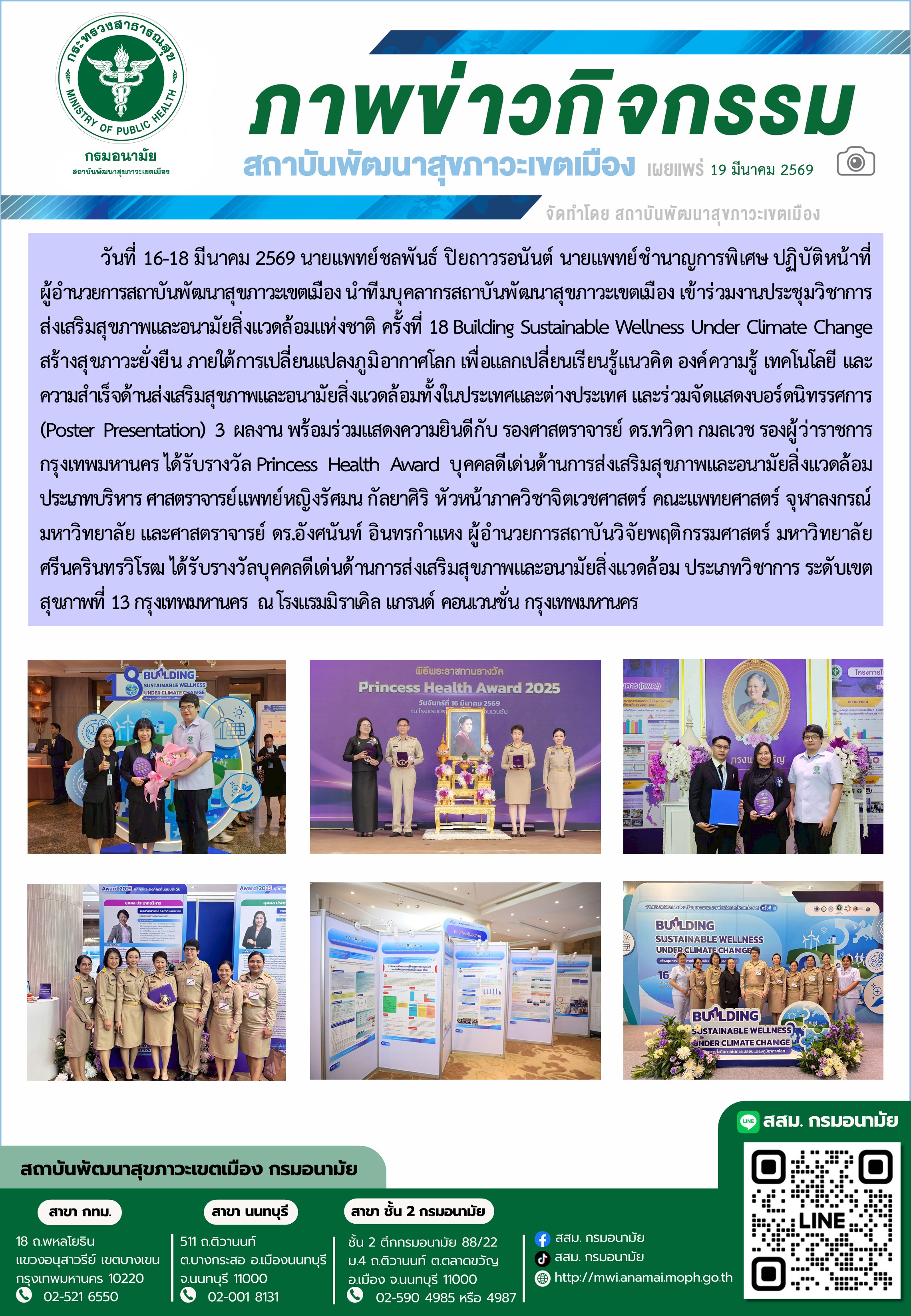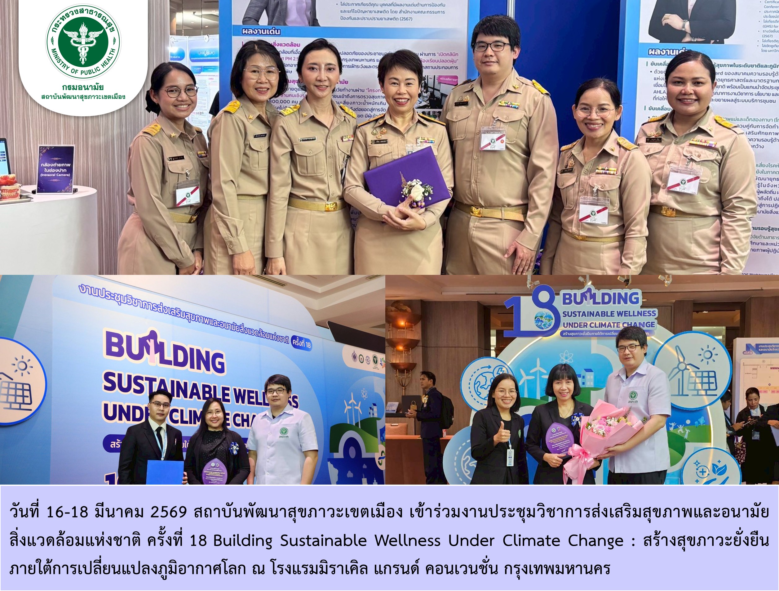 วันที่ 16-18 มีนาคม 2569 นายแพทย์ชลพันธ์ ปิยถาวรอนันต์ นายแพทย์ชำนาญการพิเศษ ปฏิบัติหน้าที่ผู้อำนวยการสถาบันพัฒนาสุขภาวะเขตเมือง นำทีมบุคลากรสถาบันพัฒนาสุขภาวะเขตเมือง เข้าร่วมงานประชุมวิชาการส่งเสริมสุขภาพและอนามัยสิ่งแวดล้อมแห่งชาติ ครั้งที่ 18 Building Sustainable Wellness Under Climate Change : สร้างสุขภาวะยั่งยืน ภายใต้การเปลี่ยนแปลงภูมิอากาศโลก เพื่อแลกเปลี่ยนเรียนรู้แนวคิด องค์ความรู้ เทคโนโลยี และความสำเร็จด้านส่งเสริมสุขภาพและอนามัยสิ่งแวดล้อมทั้งในประเทศและต่างประเทศ และร่วมจัดแสดงบอร์ดนิทรรศการ (Poster Presentation) 3 ผลงาน พร้อมร่วมแสดงความยินดีกับ รองศาสตราจารย์ ดร.ทวิดา กมลเวช รองผู้ว่าราชการกรุงเทพมหานคร ได้รับรางวัล Princess Health Award บุคคลดีเด่นด้านการส่งเสริมสุขภาพและอนามัยสิ่งแวดล้อม ประเภทบริหาร ศาสตราจารย์แพทย์หญิงรัศมน กัลยาศิริ หัวหน้าภาควิชาจิตเวชศาสตร์ คณะแพทยศาสตร์ จุฬาลงกรณ์มหาวิทยาลัย และศาสตราจารย์ ดร.อังศนันท์ อินทรกำแหง ผู้อำนวยการสถาบันวิจัยพฤติกรรมศาสตร์ มหาวิทยาลัยศรีนครินทรวิโรฒ ได้รับรางวัลบุคคลดีเด่นด้านการส่งเสริมสุขภาพและอนามัยสิ่งแวดล้อม ประเภทวิชาการ ระดับเขตสุขภาพที่ 13 กรุงเทพมหานคร ณ โรงแรมมิราเคิล แกรนด์ คอนเวนชั่น กรุงเทพมหานคร
