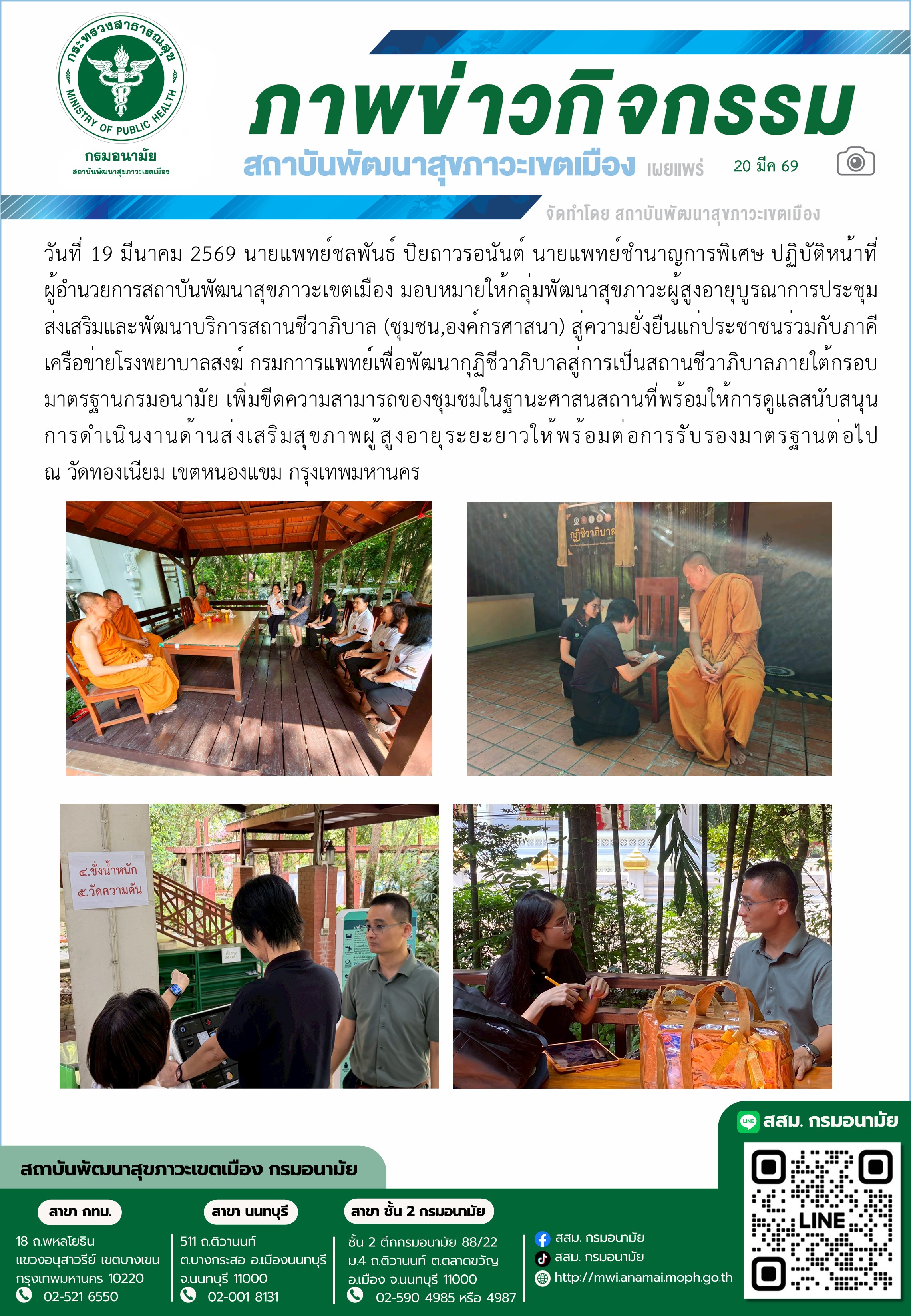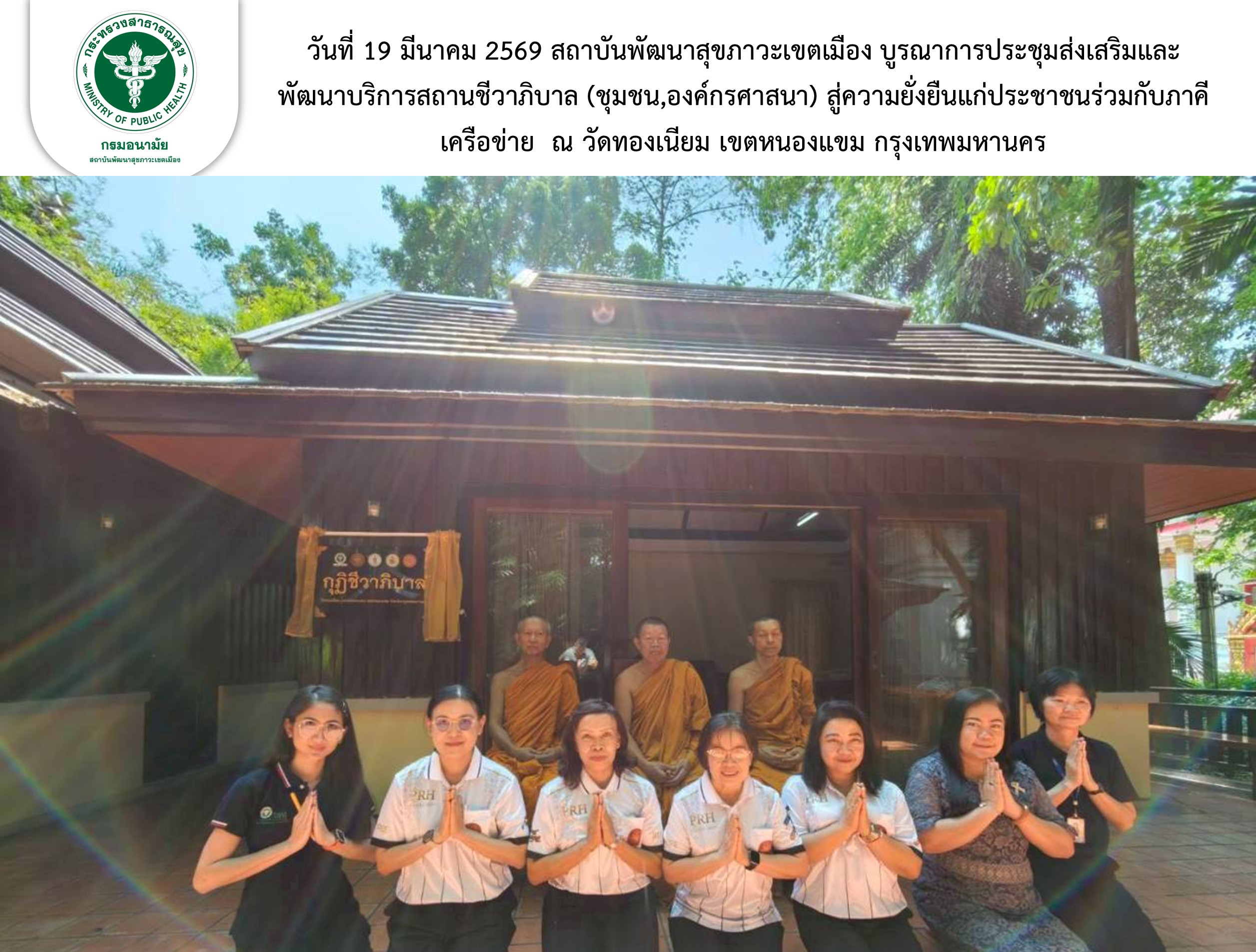นที่ 19 มีนาคม 2569 สถาบันพัฒนาสุขภาวะเขตเมือง บูรณาการประชุมส่งเสริมและพัฒนาบริการสถานชีวาภิบาล (ชุมชน,องค์กรศาสนา) สู่ความยั่งยืนแก่ประชาชนร่วมกับภาคีเครือข่าย ณ วัดทองเนียม เขตหนองแขม กรุงเทพมหานคร