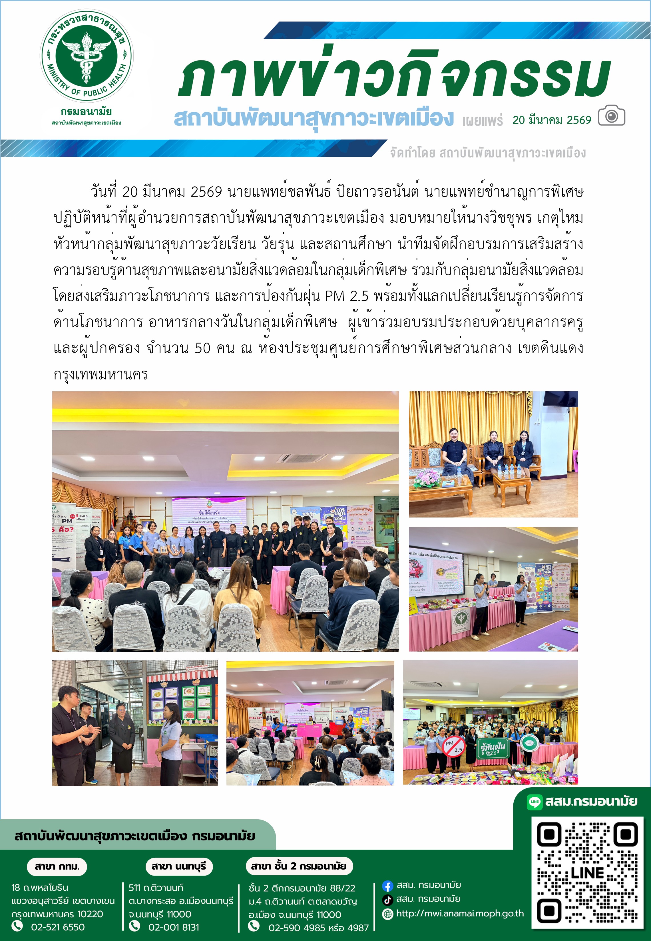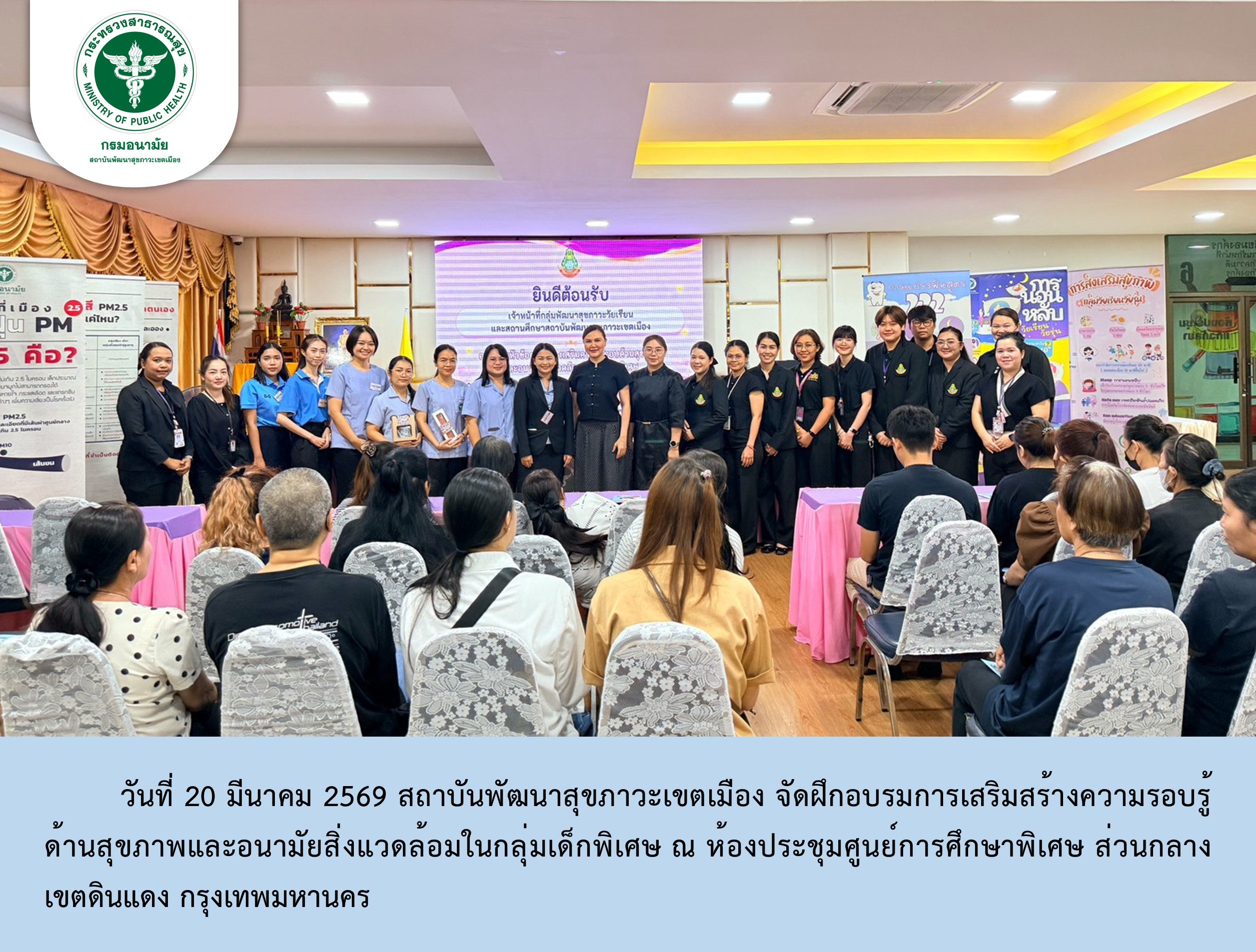 นที่ 20 มีนาคม 2569 สถาบันพัฒนาสุขภาวะเขตเมือง จัดฝึกอบรมการเสริมสร้างความรอบรู้ด้านสุขภาพและอนามัยสิ่งแวดล้อมในกลุ่มเด็กพิเศษ ณ ห้องประชุมศูนย์การศึกษาพิเศษ ส่วนกลาง เขตดินแดง กรุงเทพมหานคร