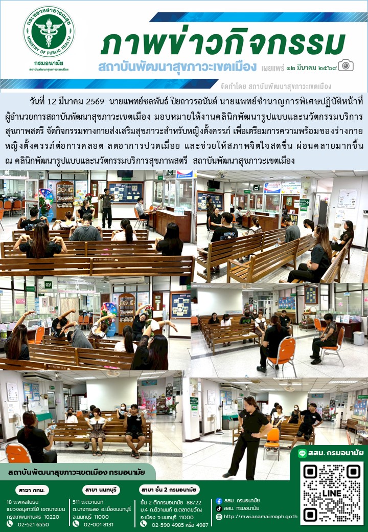 นที่ 12 มีนาคม 2569 สถาบันพัฒนาสุขภาวะเขตเมือง จัดกิจกรรมทางกายส่งเสริมสุขภาวะสำหรับหญิงตั้งครรภ์ ณ คลินิกพัฒนารูปแบบและนวัตกรรมบริการสุขภาพสตรี สถาบันพัฒนาสุขภาวะเขตเมือง