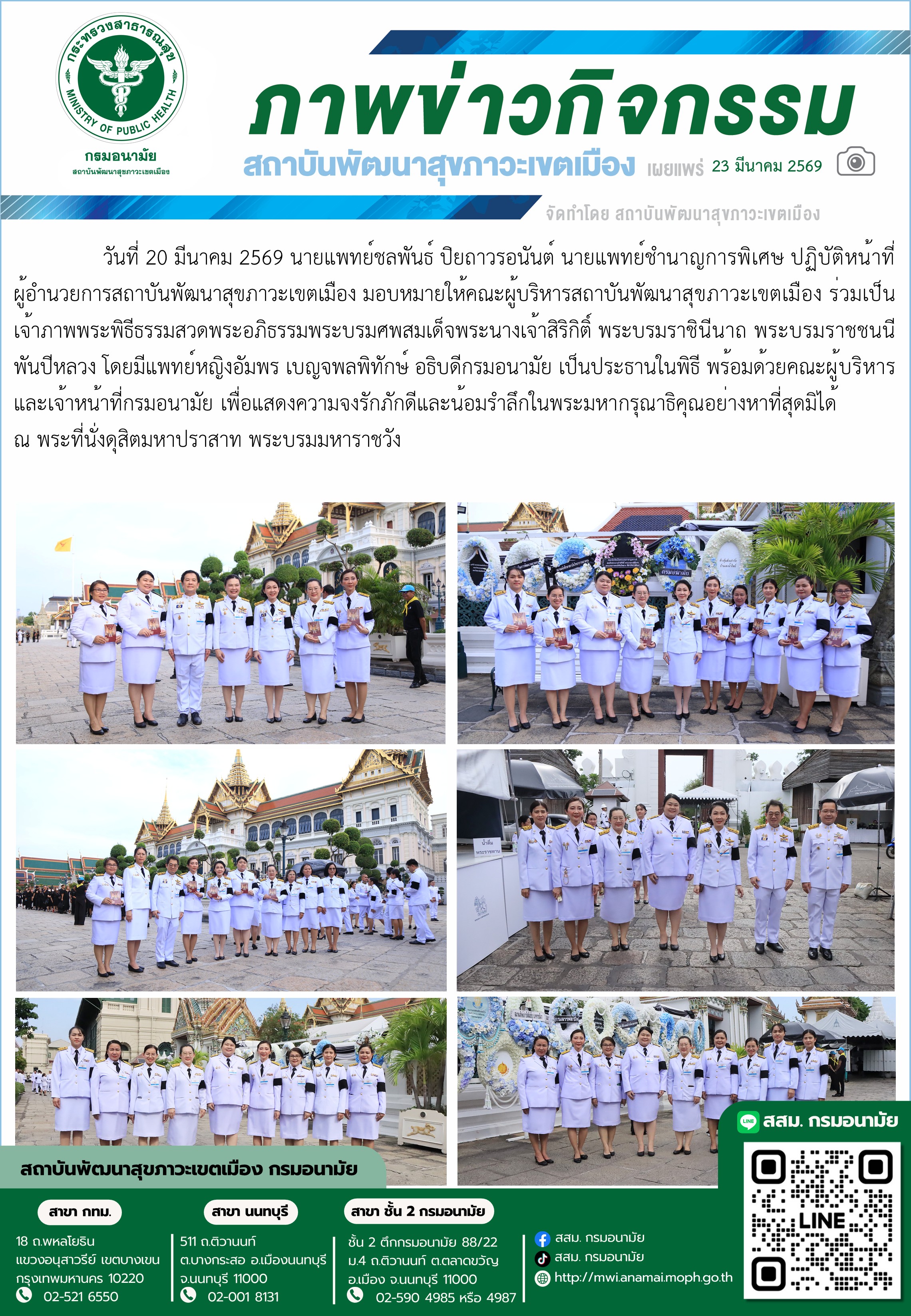 นที่ 20 มีนาคม 2569 สถาบันพัฒนาสุขภาวะเขตเมือง ร่วมเป็นเจ้าภาพพระพิธีธรรมสวดพระอภิธรรมพระบรมศพ สมเด็จพระนางเจ้าสิริกิติ์ พระบรมราชินีนาถ พระบรมราชชนนีพันปีหลวง ณ พระที่นั่งดุสิตมหาปราสาท พระบรมมหาราชวัง