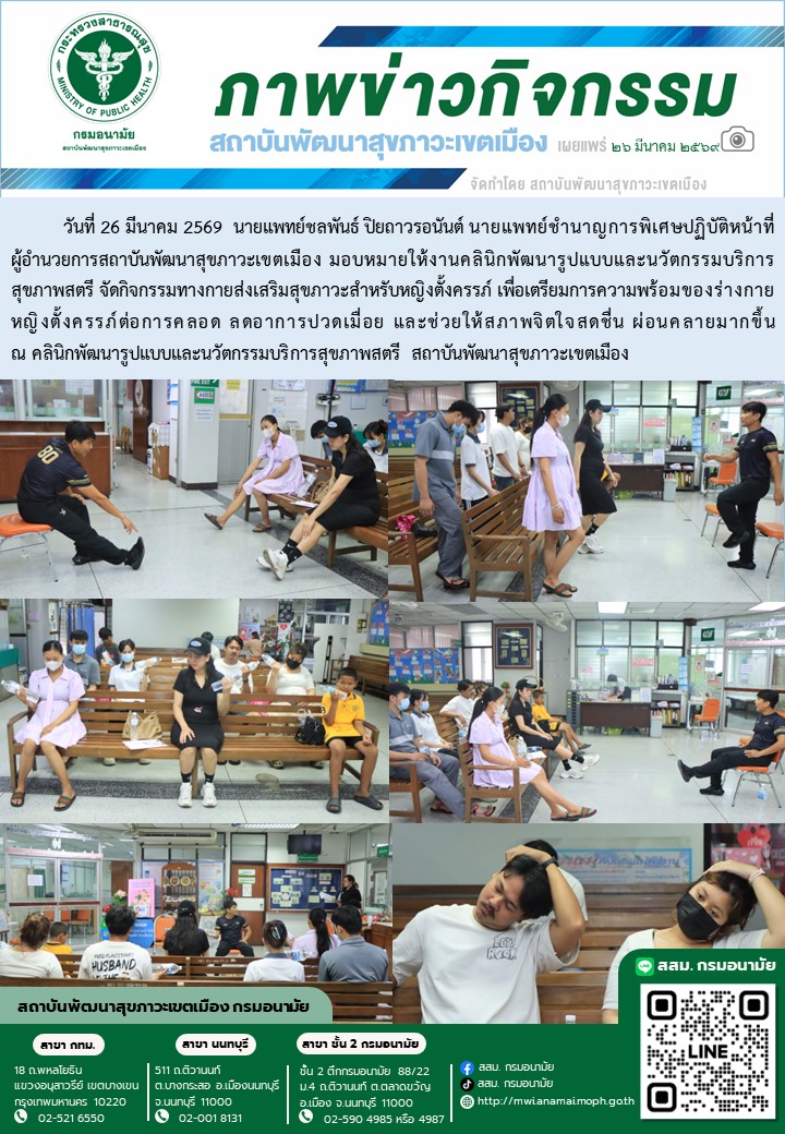 วันที่ 26 มีนาคม 2569 นายแพทย์ชลพันธ์ ปิยถาวรอนันต์ นายแพทย์ชำนาญการพิเศษ ปฏิบัติหน้าที่ผู้อำนวยการสถาบันพัฒนาสุขภาวะเขตเมือง มอบหมายให้งานคลินิกพัฒนารูปแบบและนวัตกรรมบริการสุขภาพสตรี จัดกิจกรรมทางกายส่งเสริมสุขภาวะสำหรับหญิงตั้งครรภ์ เพื่อเตรียมการความพร้อมของร่างกายหญิงตั้งครรภ์ต่อการคลอด ลดอาการปวดเมื่อย และช่วยให้สภาพจิตใจสดชื่น ผ่อนคลายมากขึ้น ณ คลินิกพัฒนารูปแบบและนวัตกรรมบริการสุขภาพสตรี สถาบันพัฒนาสุขภาวะเขตเมือง