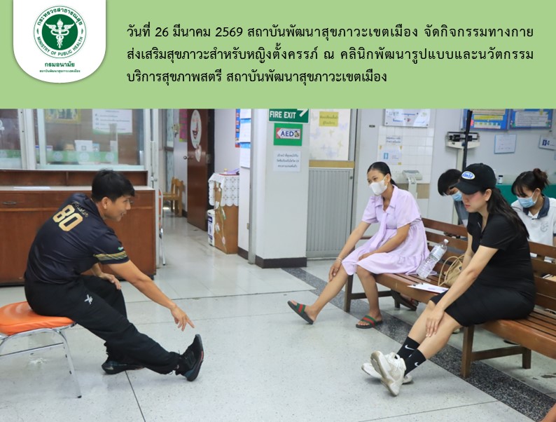 นที่ 26 มีนาคม 2569 สถาบันพัฒนาสุขภาวะเขตเมือง จัดกิจกรรมทางกายส่งเสริมสุขภาวะสำหรับหญิงตั้งครรภ์ ณ คลินิกพัฒนารูปแบบและนวัตกรรมบริการสุขภาพสตรี สถาบันพัฒนาสุขภาวะเขตเมือง