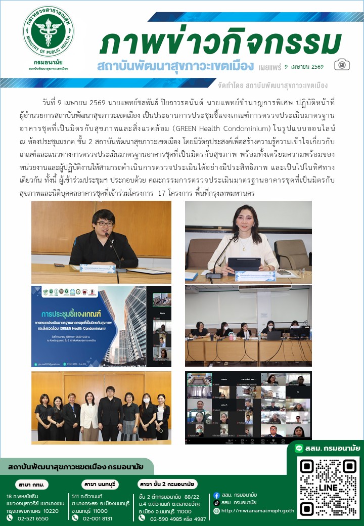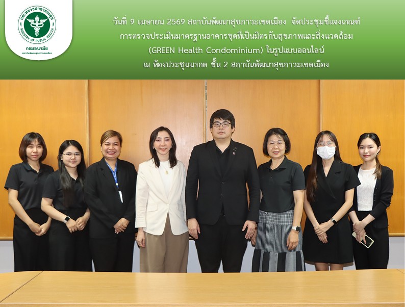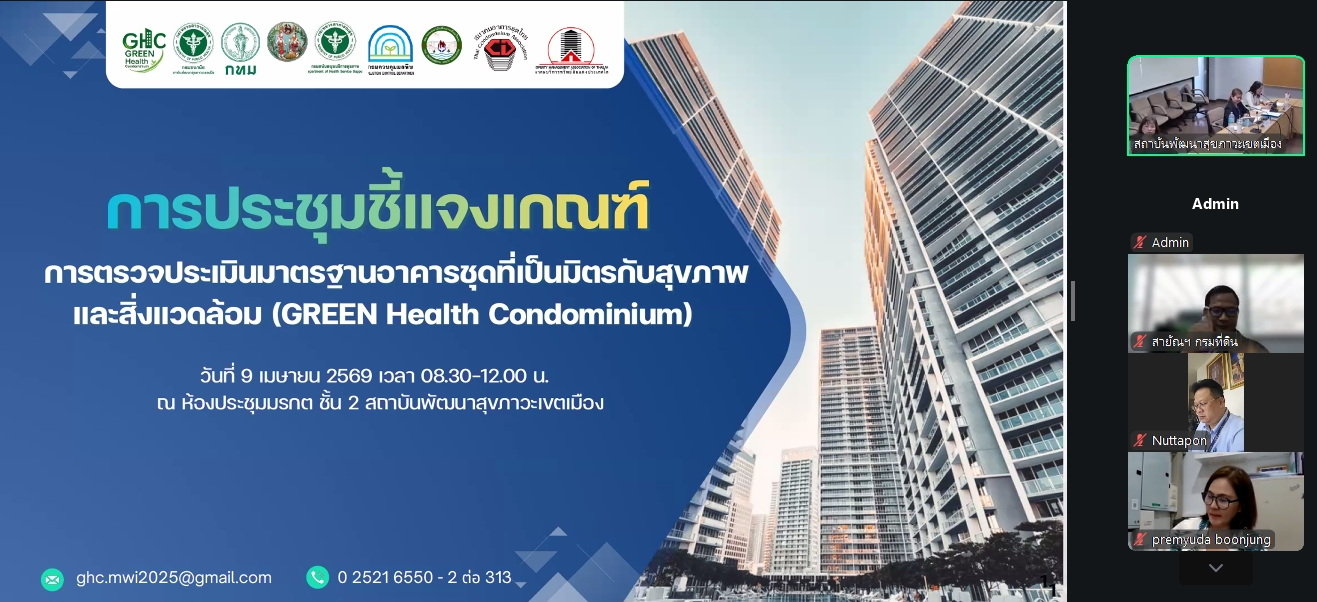 นที่ 9 เมษายน 2569 สถาบันพัฒนาสุขภาวะเขตเมือง จัดประชุมชี้แจงเกณฑ์การตรวจประเมินมาตรฐานอาคารชุดที่เป็นมิตรกับสุขภาพและสิ่งแวดล้อม (GREEN Health Condominium) ในรูปแบบออนไลน์ ณ ห้องประชุมมรกต ชั้น 2 สถาบันพัฒนาสุขภาวะเขตเมือง