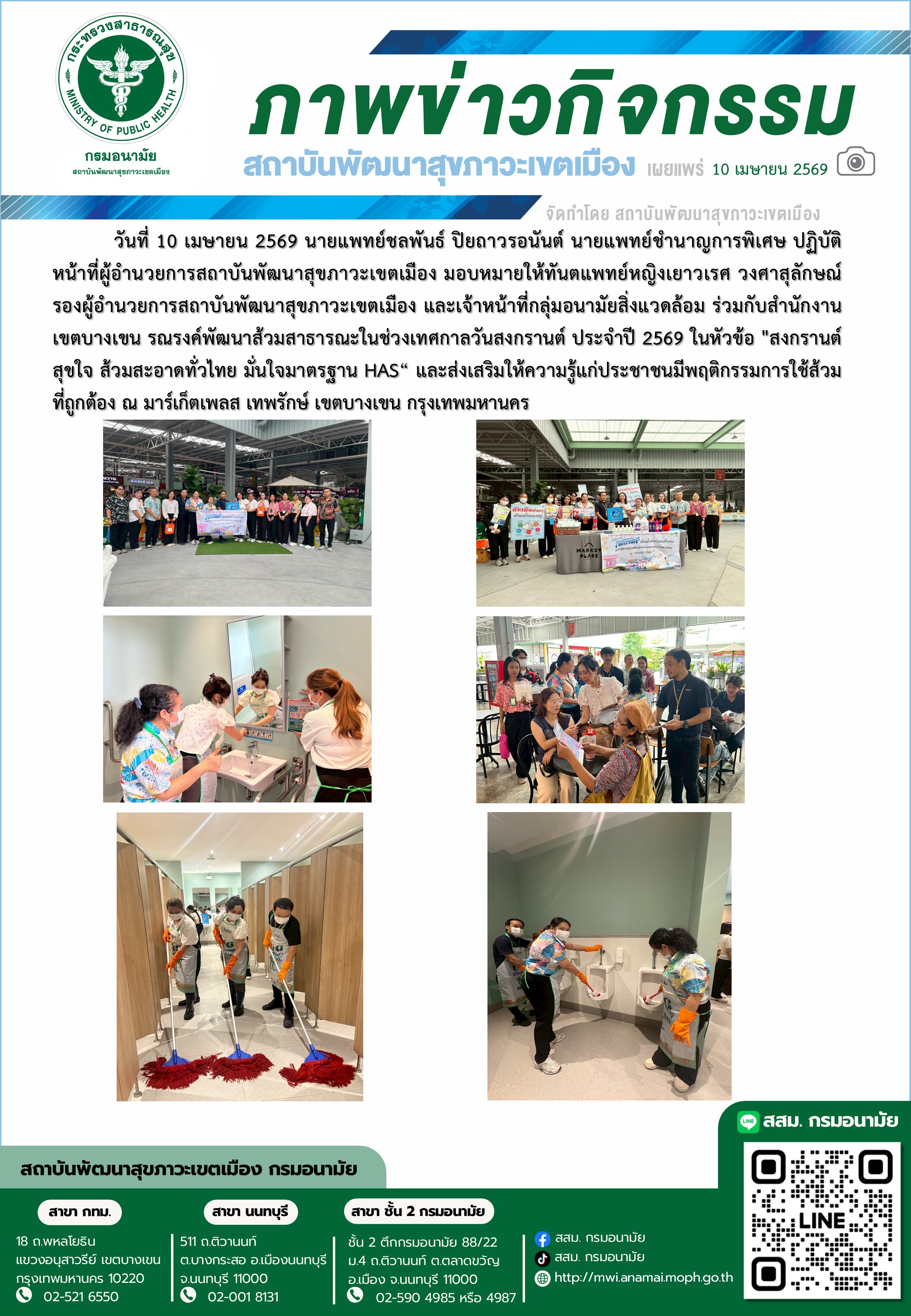 วันที่ 10 เมษายน 2569 นายแพทย์ชลพันธ์ ปิยถาวรอนันต์ นายแพทย์ชำนาญการพิเศษ ปฏิบัติหน้าที่ผู้อำนวยการสถาบันพัฒนาสุขภาวะเขตเมือง มอบหมายให้ทันตแพทย์หญิงเยาวเรศ วงศาสุลักษณ์ รองผู้อำนวยการสถาบันพัฒนาสุขภาวะเขตเมือง และเจ้าหน้าที่กลุ่มอนามัยสิ่งแวดล้อม ร่วมกับสำนักงานเขตบางเขน รณรงค์พัฒนาส้วมสาธารณะในช่วงเทศกาลวันสงกรานต์ ประจำปี 2569 ในหัวข้อ "สงกรานต์สุขใจ ส้วมสะอาดทั่วไทย มั่นใจมาตรฐาน HAS" และส่งเสริมให้ความรู้แก่ประชาชนมีพฤติกรรมการใช้ส้วมที่ถูกต้อง ณ มาร์เก็ตเพลส เทพรักษ์ เขตบางเขน กรุงเทพมหานคร
