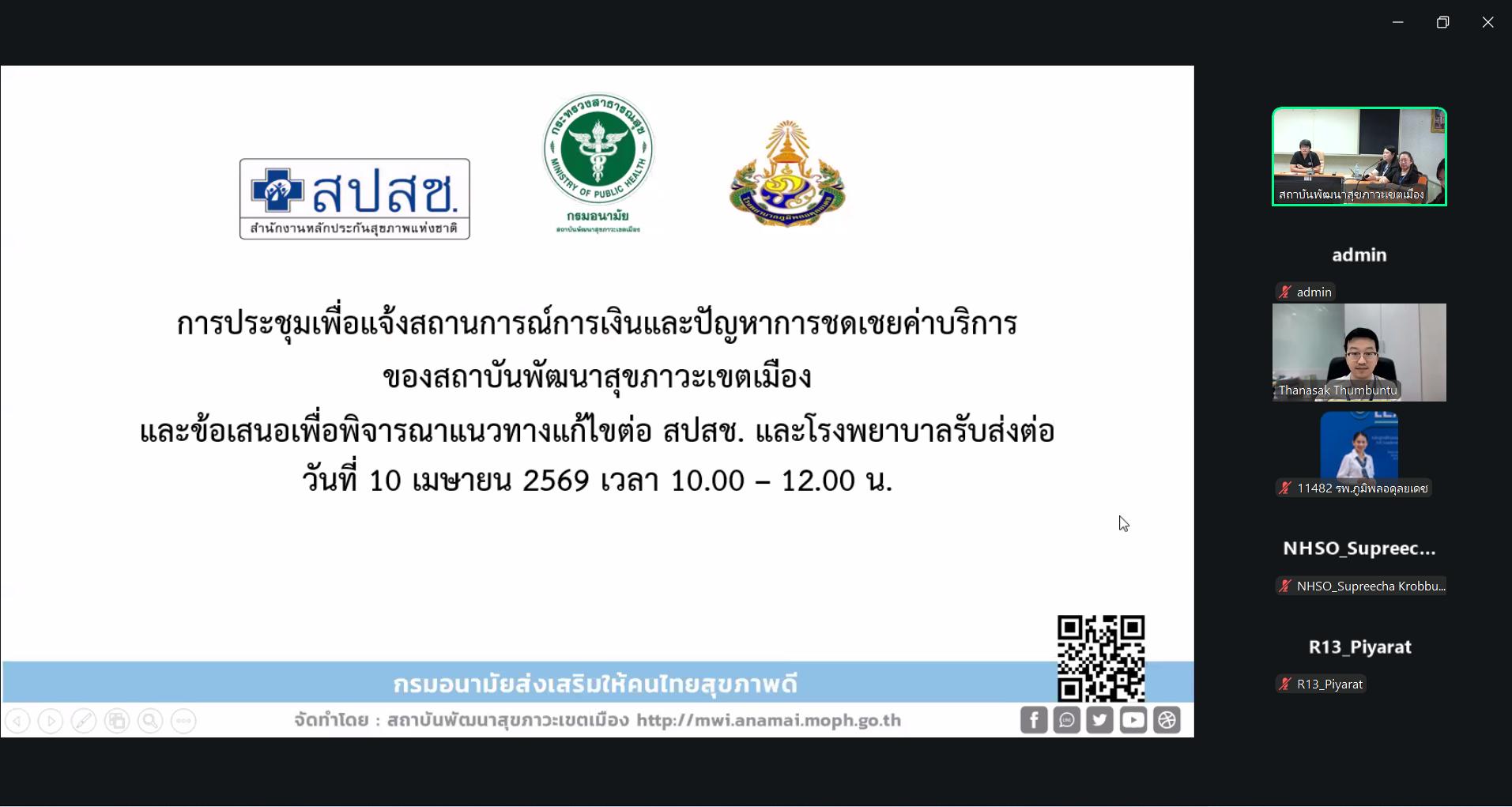 นที่ 10 เมษายน 2569 สถาบันพัฒนาสุขภาวะเขตเมือง จัดประชุมเพื่อแจ้งสถานการณ์การเงินและปัญหาการชดเชยค่าบริการของสถาบันพัฒนาสุขภาวะเขตเมือง และข้อเสนอเพื่อพิจารณาแนวทางแก้ไขต่อ สปสช.และโรงพยาบาลรับส่งต่อ ผ่านระบบออนไลน์ ด้วยโปรแกรม Zoom Meeting
