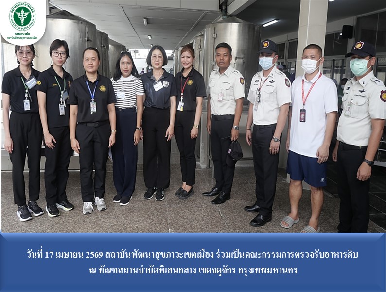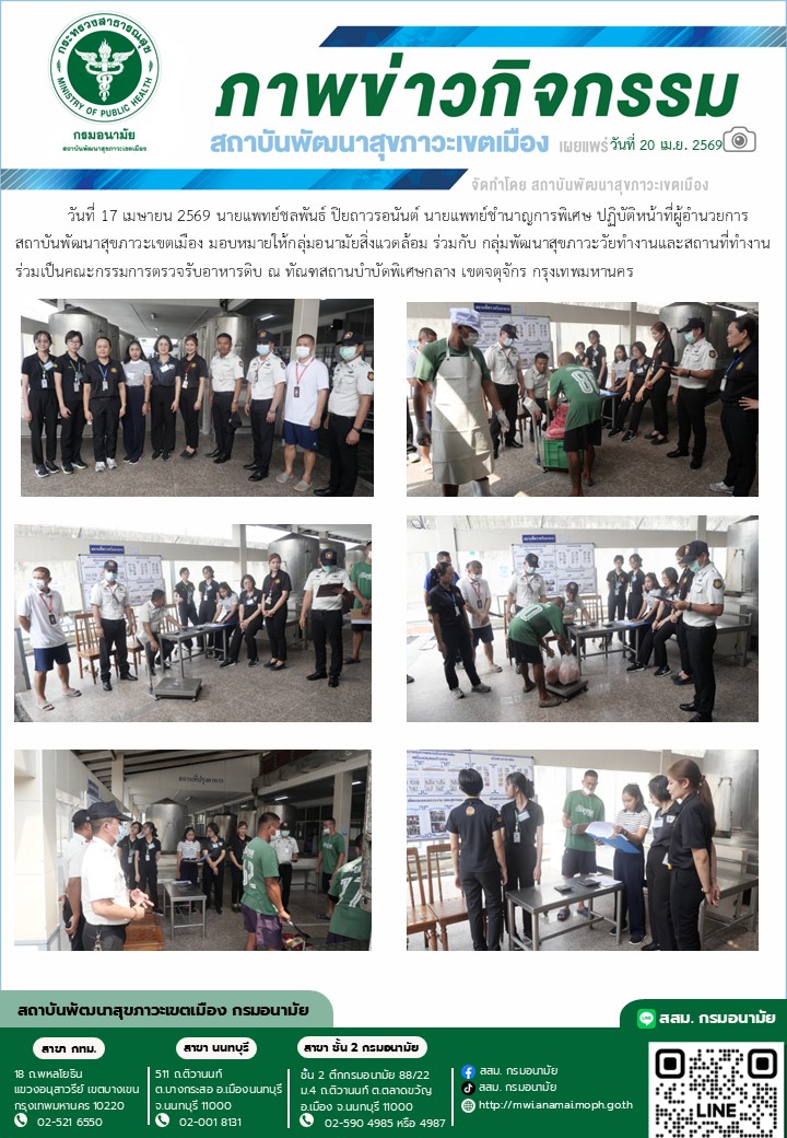 วันที่ 17 เมษายน 2569 นายแพทย์ชลพันธ์ ปิยถาวรอนันต์ นายแพทย์ชำนาญการพิเศษ ปฏิบัติหน้าที่ผู้อำนวยการสถาบันพัฒนาสุขภาวะเขตเมือง มอบหมายให้กลุ่มอนามัยสิ่งแวดล้อม ร่วมกับ กลุ่มพัฒนาสุขภาวะวัยทำงานและสถานที่ทำงาน ร่วมเป็นคณะกรรมการตรวจรับอาหารดิบ ณ ทัณฑสถานบำบัดพิเศษกลาง เขตจตุจักร กรุงเทพมหานคร