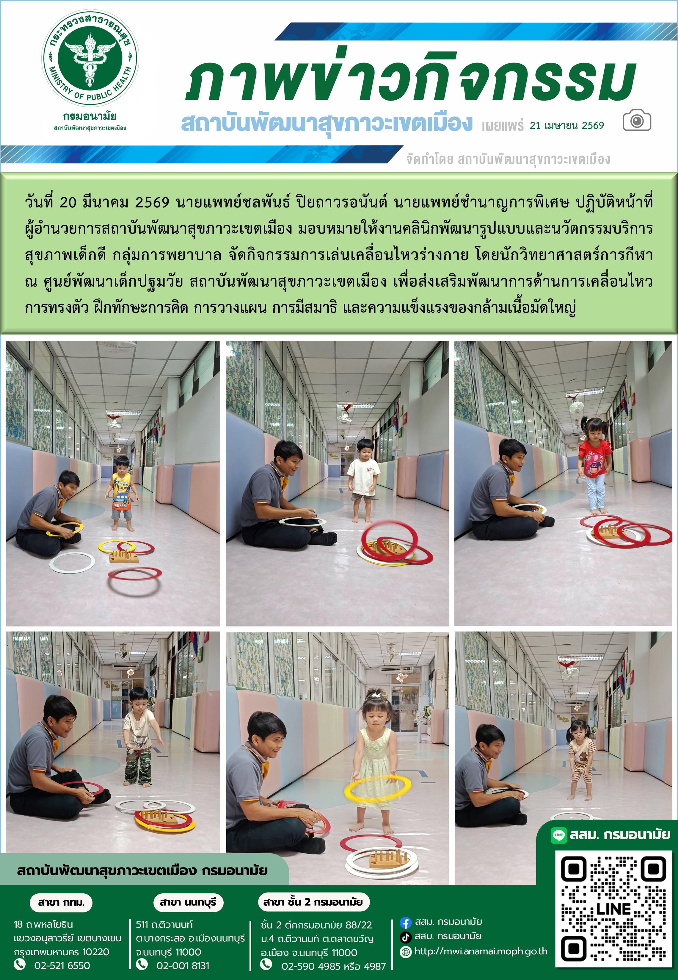 วันที่ 20 มีนาคม 2569 นายแพทย์ชลพันธ์ ปิยถาวรอนันต์ นายแพทย์ชำนาญการพิเศษ ปฏิบัติหน้าที่ผู้อำนวยการสถาบันพัฒนาสุขภาวะเขตเมือง มอบหมายให้งานคลินิกพัฒนารูปแบบและนวัตกรรมบริการสุขภาพเด็กดี กลุ่มการพยาบาล จัดกิจกรรมการเล่นเคลื่อนไหวร่างกาย โดยนักวิทยาศาสตร์การกีฬา ณ ศูนย์พัฒนาเด็กปฐมวัย สถาบันพัฒนาสุขภาวะเขตเมือง เพื่อส่งเสริมพัฒนาการด้านการเคลื่อนไหว การทรงตัว ฝึกทักษะการคิด การวางแผน การมีสมาธิ และความแข็งแรงของกล้ามเนื้อมัดใหญ่