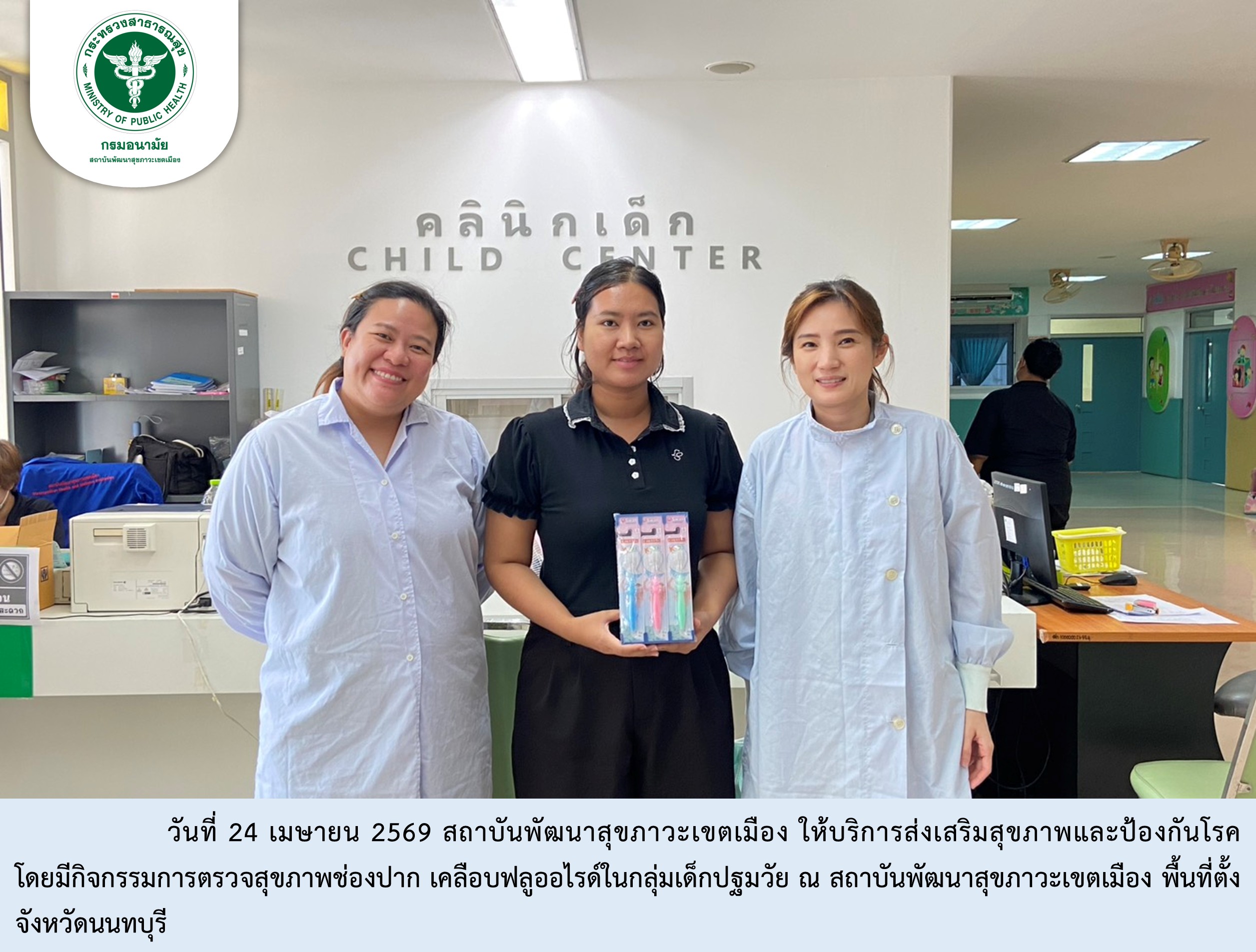 นที่ 24 เมษายน 2569 สถาบันพัฒนาสุขภาวะเขตเมือง ให้บริการส่งเสริมสุขภาพและป้องกันโรค โดยมีกิจกรรมการตรวจสุขภาพช่องปาก เคลือบฟลูออไรด์ในกลุ่มเด็กปฐมวัย ณ สถาบันพัฒนาสุขภาวะเขตเมือง พื้นที่ตั้งจังหวัดนนทบุรี