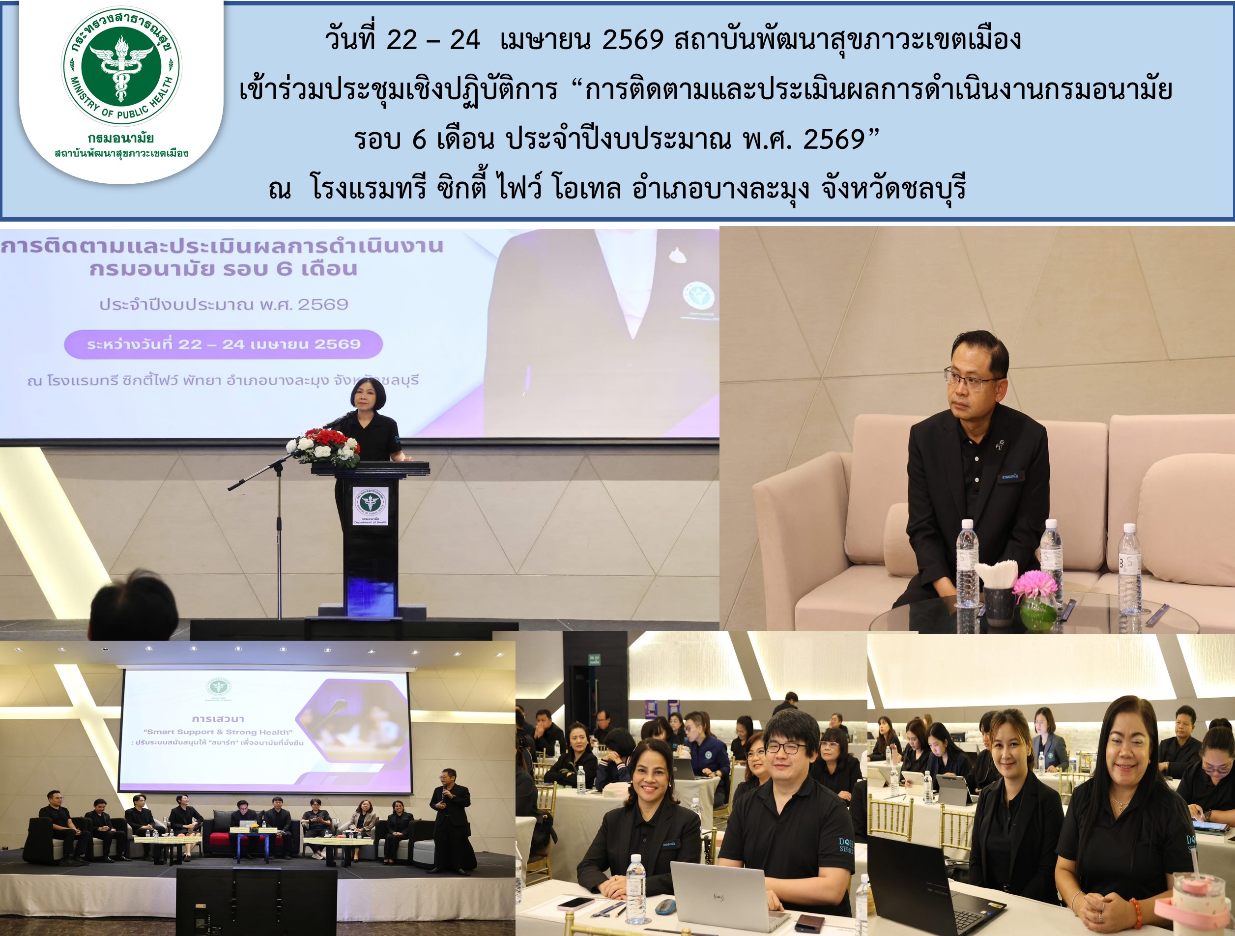 นที่ 22 – 24 เมษายน 2569 สถาบันพัฒนาสุขภาวะเขตเมือง เข้าร่วมประชุมเชิงปฏิบัติการ “การติดตามและประเมินผลการดำเนินงานกรมอนามัย รอบ 6 เดือน ประจำปีงบประมาณ พ.ศ. 2569” ณ โรงแรมทรี ซิกตี้ ไฟว์ โอเทล อำเภอบางละมุง จังหวัดชลบุรี