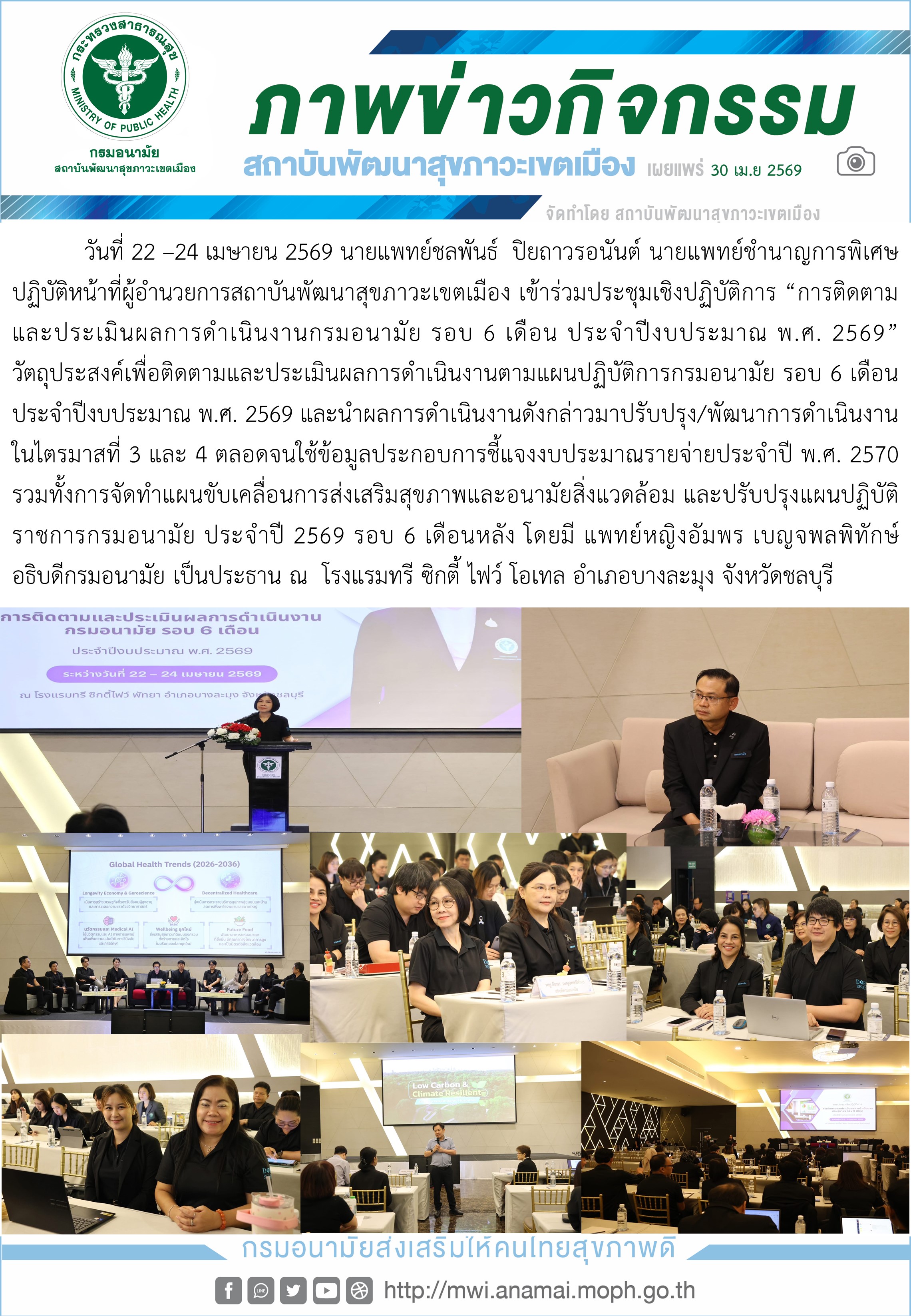 วันที่ 22 –24 เมษายน 2569 นายแพทย์ชลพันธ์ ปิยถาวรอนันต์ นายแพทย์ชำนาญการพิเศษปฏิบัติหน้าที่ผู้อำนวยการสถาบันพัฒนาสุขภาวะเขตเมือง เข้าร่วมประชุมเชิงปฏิบัติการ “การติดตามและประเมินผลการดำเนินงานกรมอนามัย รอบ 6 เดือน ประจำปีงบประมาณ พ.ศ. 2569” วัตถุประสงค์เพื่อติดตามและประเมินผลการดำเนินงานตามแผนปฏิบัติการกรมอนามัย รอบ 6 เดือน ประจำปีงบประมาณ พ.ศ. 2569 และนำผลการดำเนินงานดังกล่าวมาปรับปรุง/พัฒนาการดำเนินงาน ในไตรมาสที่ 3 และ 4 ตลอดจนใช้ข้อมูลประกอบการชี้แจงงบประมาณรายจ่ายประจำปี พ.ศ. 2570รวมทั้งการจัดทำแผนขับเคลื่อนการส่งเสริมสุขภาพและอนามัยสิ่งแวดล้อม และปรับปรุงแผนปฏิบัติราชการกรมอนามัย ประจำปี 2569 รอบ 6 เดือนหลัง โดยมี แพทย์หญิงอัมพร เบญจพลพิทักษ์ อธิบดีกรมอนามัย เป็นประธาน ณ โรงแรมทรี ซิกตี้ ไฟว์ โอเทล อำเภอบางละมุง จังหวัดชลบุรี